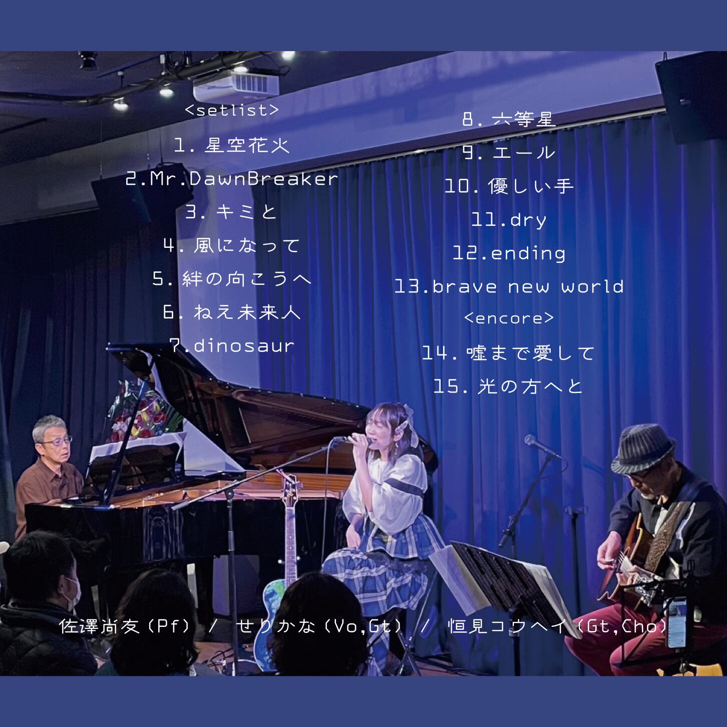 出演:せりかな(Vo,Gt) / 恒見コウヘイ(Gt, Cho) / 佐澤尚友(Pf)